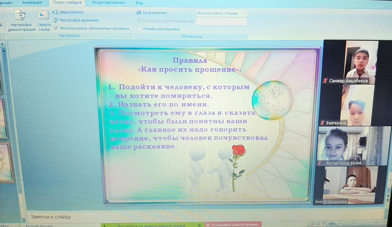 В рамках декады "Самопознание: педагогики Любви и творчества " 02.02.2021г. проведен открытый урок во 2 "В" классе. Тема : "Учимся прощать " Преподаватель: Имирова С.Х. Цель урока : расширение и углубление представлений об общечеловеческой ценности- внутреннем покое. Раскрыта важность умения прощать и понимать другого человека, воспитывать такие качества как доброта , великодушие , толерантность у учащихся.