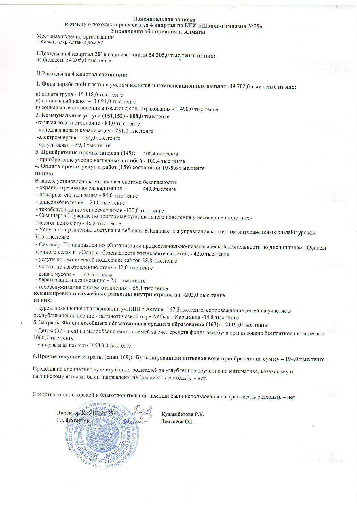 » Отчет о доходах и расходах за 4 Квартал 2016 и пояснительная записка