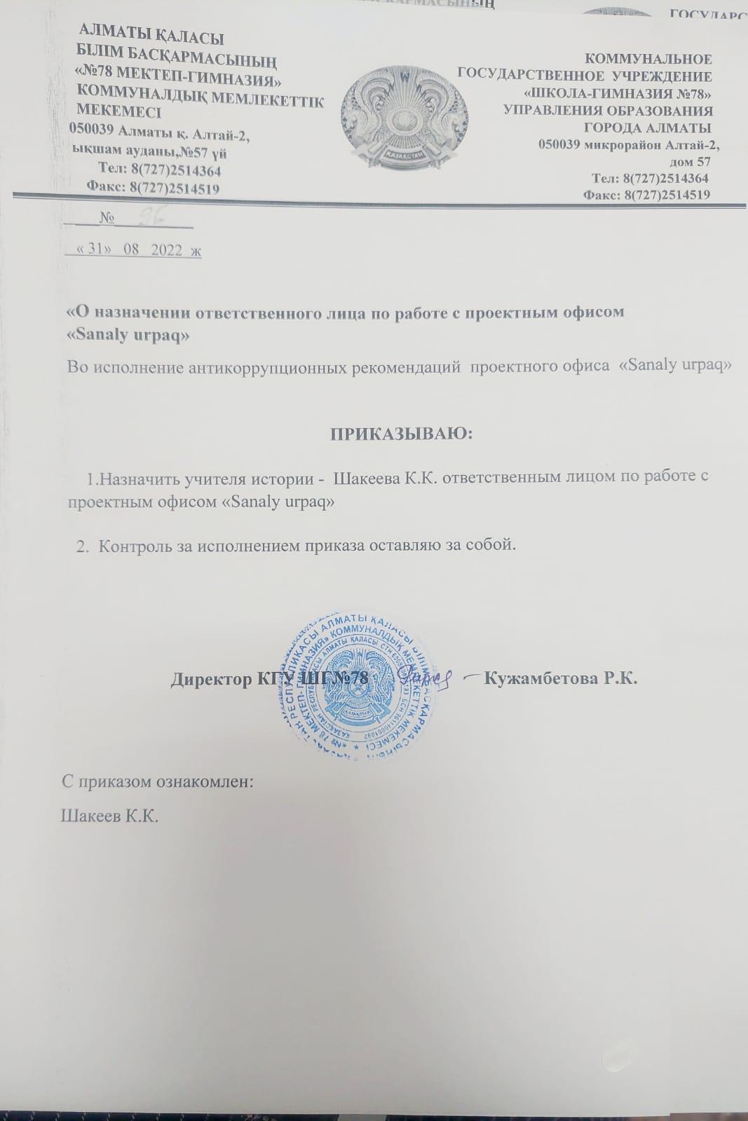 Саналы ұрпақ клубының жауапты маманын тағайындау бұйрығы