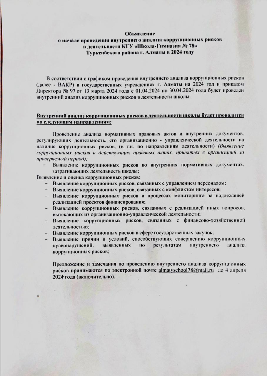 27 ақпан 2024 0 1 2 3 4 5 Сыбайлас жемқорлыққа қарсы күрес бойынша ішкі талдау жұмысын жүргізу туралы\ О проведении внутреннего анализа коррупционных рисков