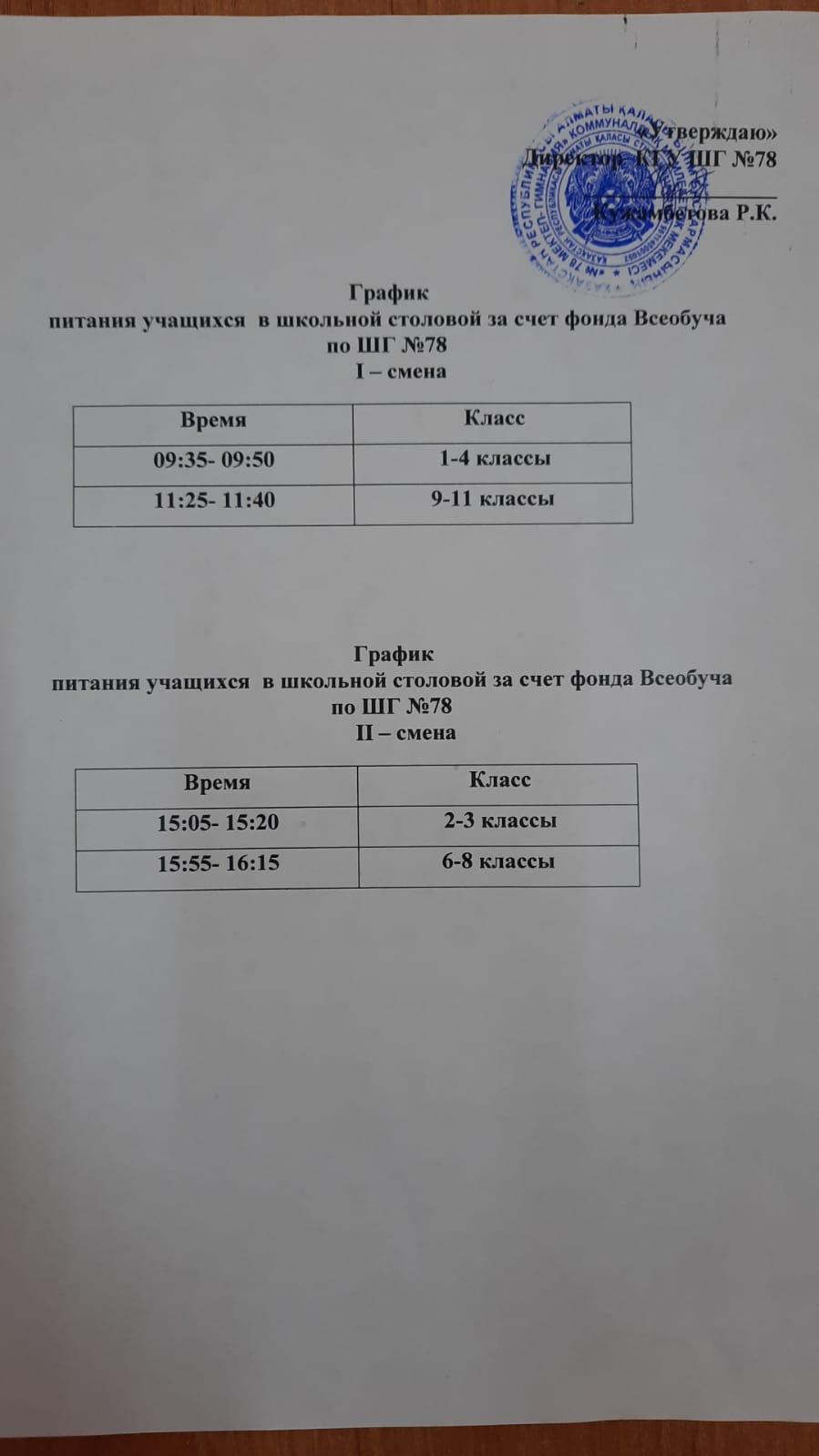 01 қыркүйек 2021 0 1 2 3 4 5 График питания учащихся в школьной столовой за счет фонда Всеобуча по ШГ №78