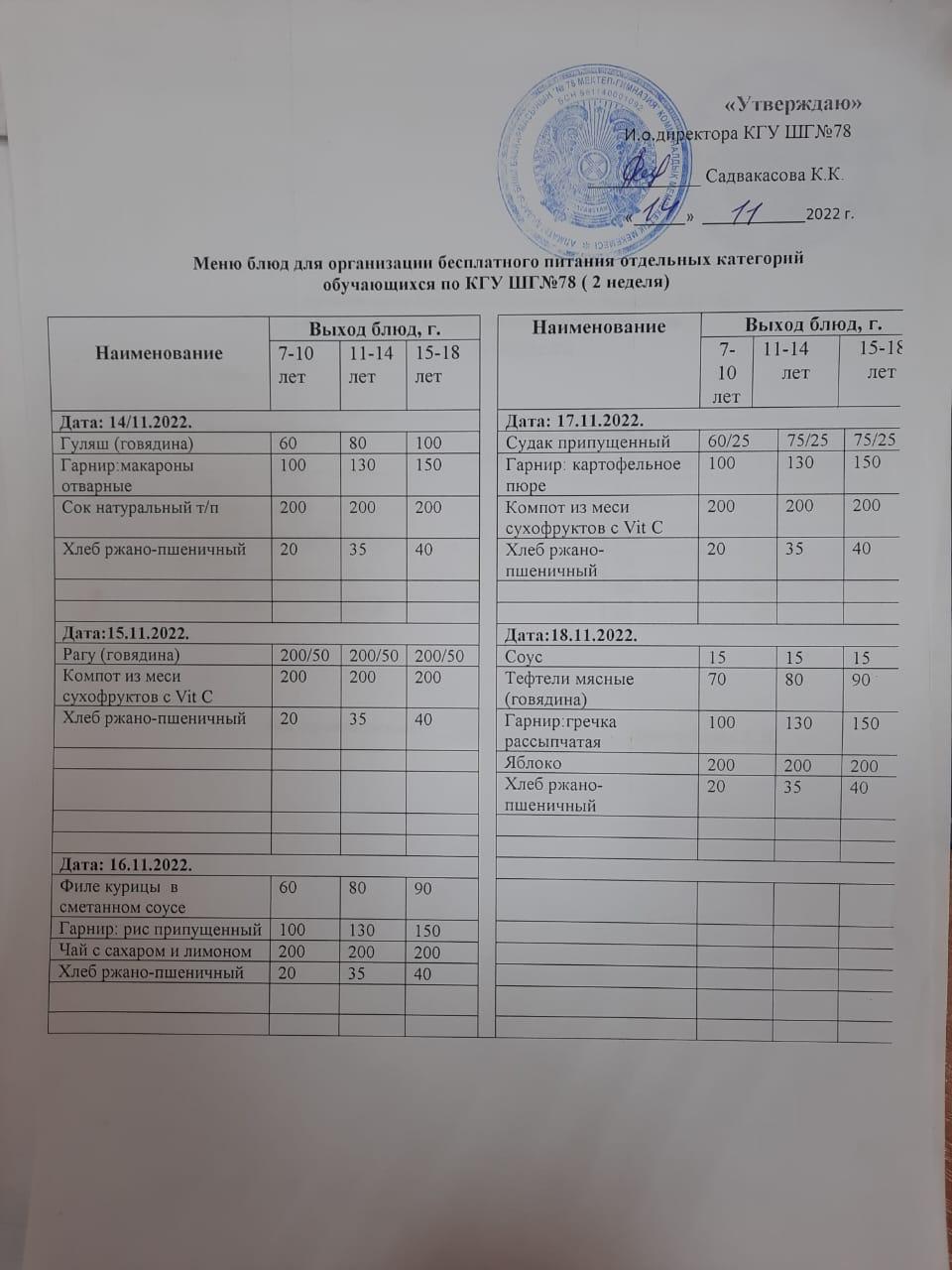 4 апталық ас мәзірі. Четырехнедельное меню блюд для организации бесплатного питания обучающихся в организациях среднего образования за счет бюджетных средств (XI-XII)