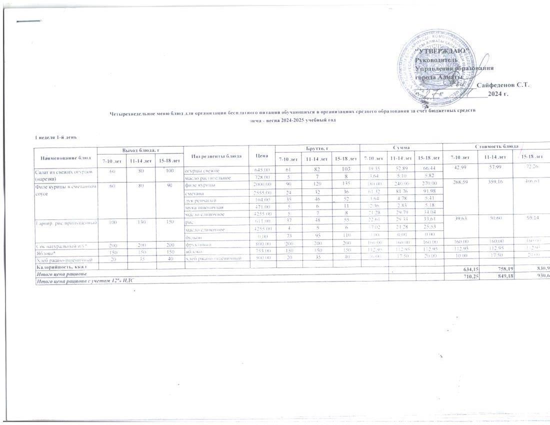 Бюджеттік қаражат есебінен орта білім беру ұйымдарында оқушыларды тегін тамақтандыруды ұйымдастыруға арналған төрт апталық тағамдар мәзірі, қыс-көктем 2024-2025 ж.ж.Четырехнедельное меню питания для организации бесплатного питания зима-весна 24-25
