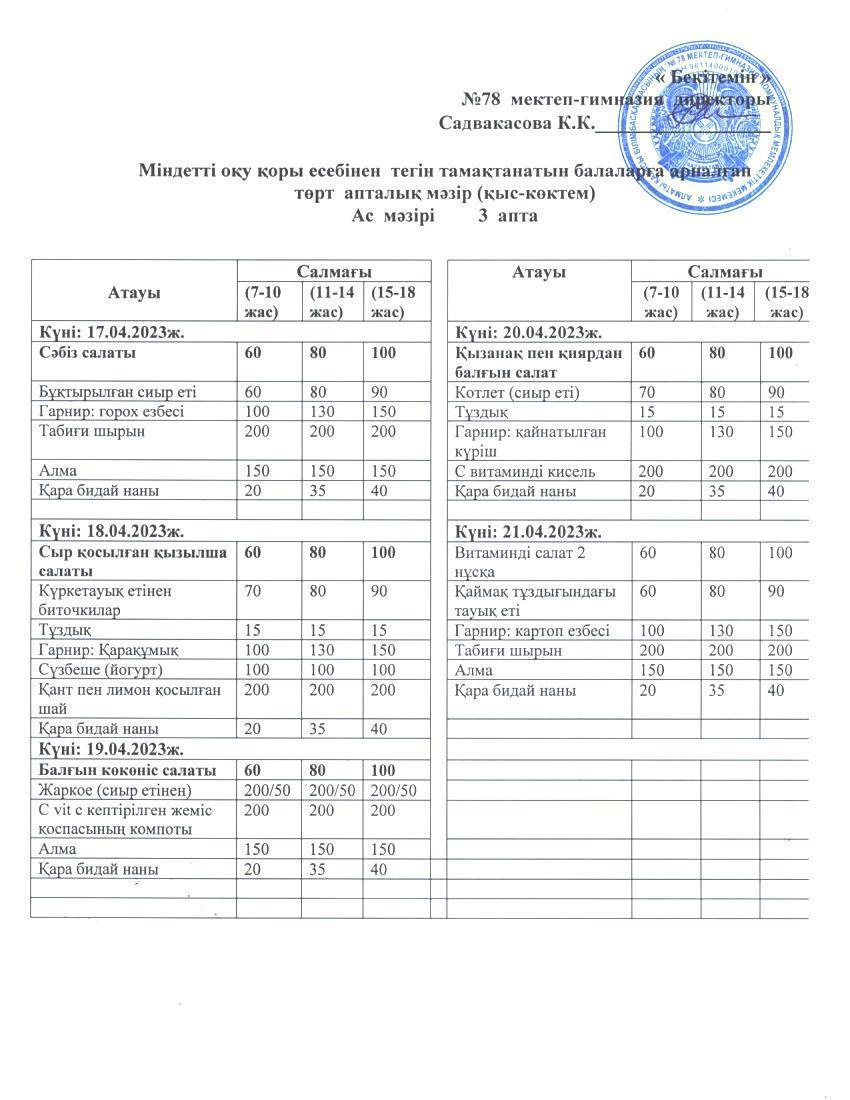 Ас мәзірі 1 апта