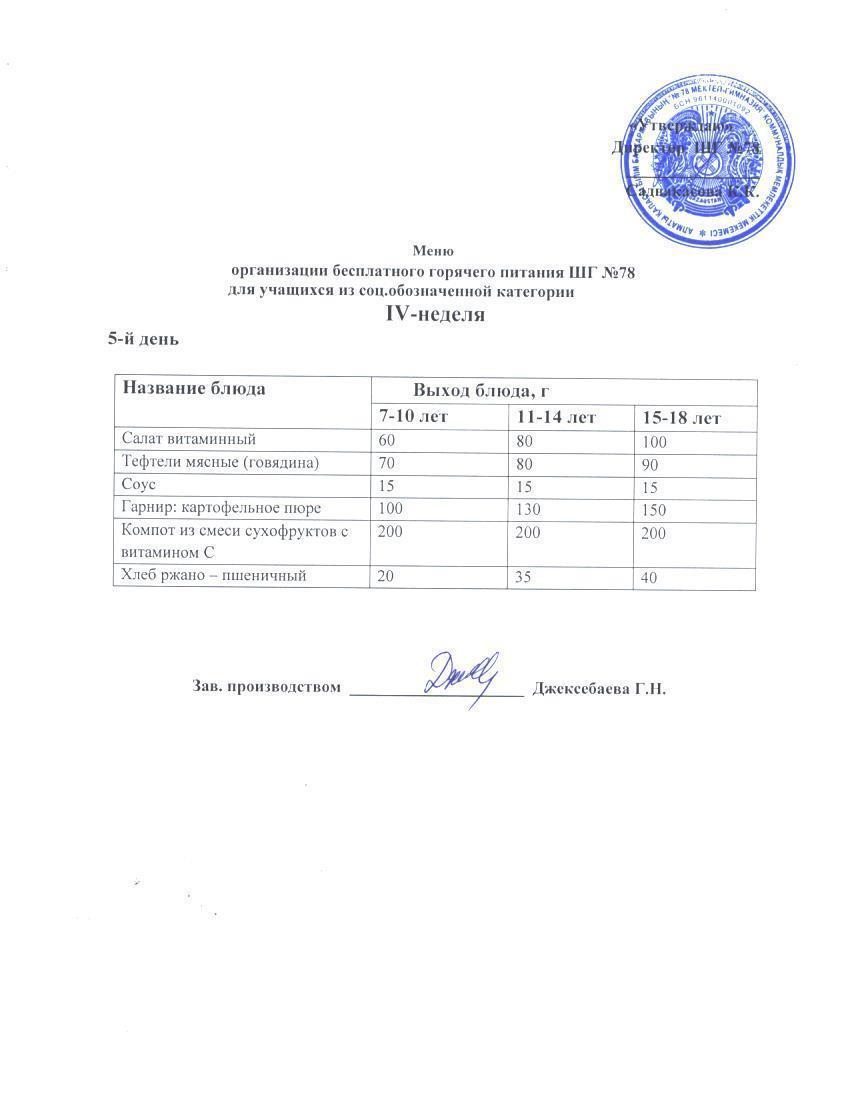 4 апталық ас мәзірі. Четырехнедельное меню блюд для организации бесплатного питания обучающихся в организациях среднего образования за счет бюджетных средств лето - осень