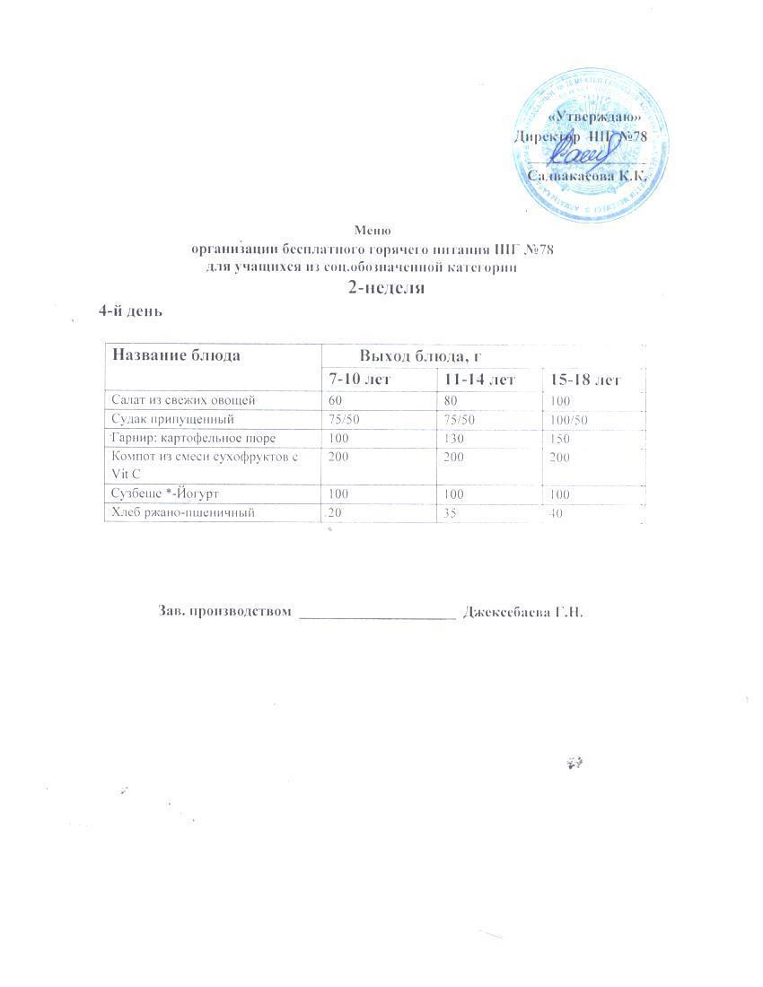 Бюджеттік қаражат есебінен орта білім беру ұйымдарында оқушыларды тегін тамақтандыруды ұйымдастыруға арналған төрт апталық тағамдар мәзірі, жаз-күз 2024ж 2024 г.