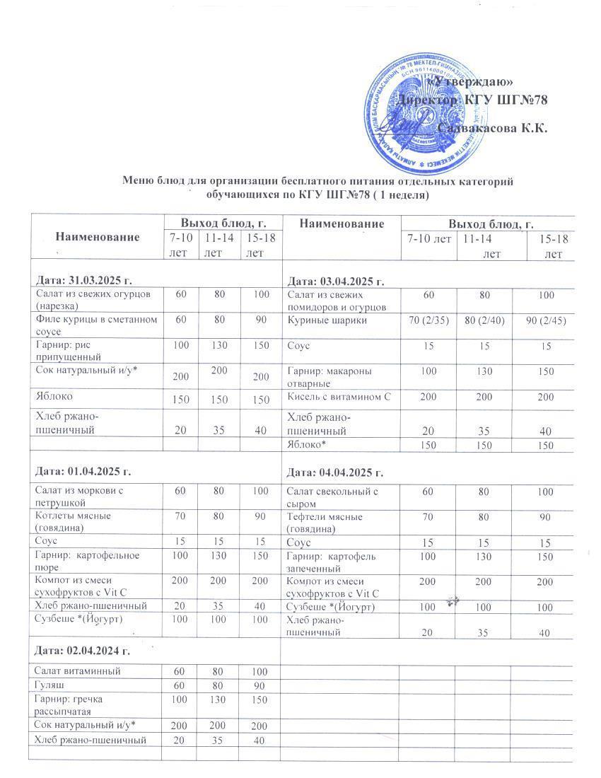 Ас мәзірі 1 апта