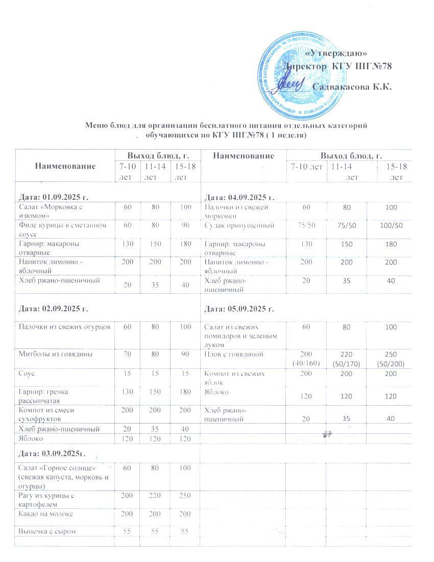 Ас мәзірі 1 апта