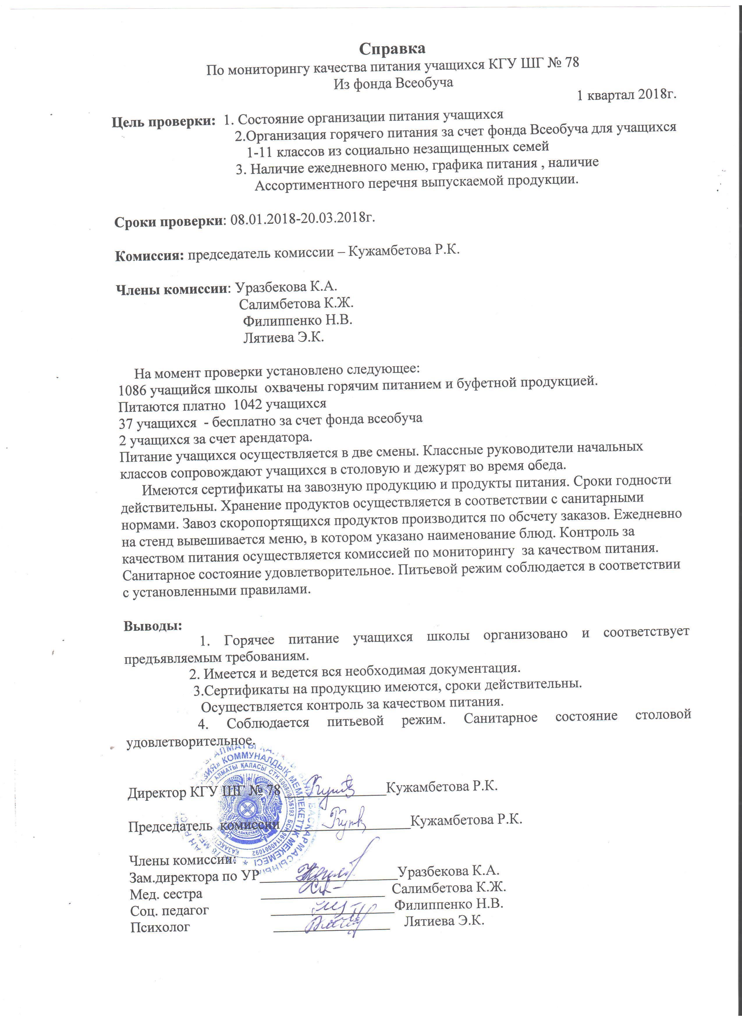 Справка по организации питания обучающихся КГУ ШГ№78 в 2016-2017 учебном году